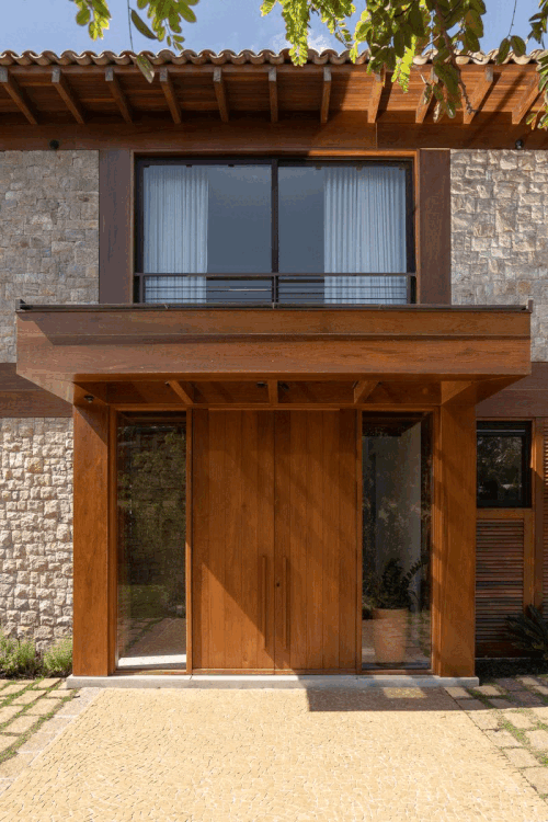 PEDRA E MADEIRA SÃO OS ELEMENTOS MARCANTES NA FACHADA DESTE PROJETO NO INTERIOR PAULISTANO. OS CAIXILHOS DE MADEIRA E A CERAMICA NO PISO ATENDEM À ESPECTATIVA DOS PROPRIETARIOS DE GARANTIR UMA ESSENCIA DE FAZENDA NESTA CASA DE CAMPO.